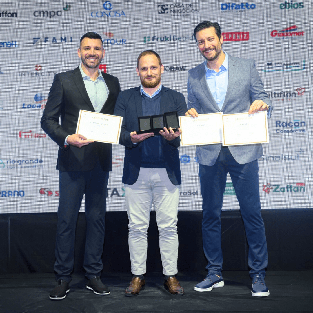 Nosso diretor geral, Hélio Comparsi Limas, recebeu a premiação em nome da EVR, ao lado do presidente executivo da entidade, Diego Biglia (à direita da tela), e do vice-presidente de esportes, Fabiano Toigo (à esquerda da tela).